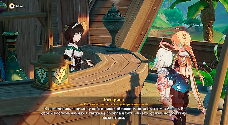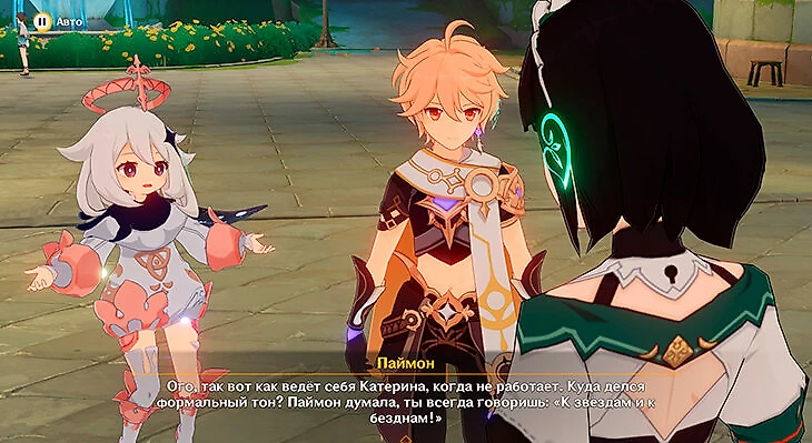Вскоре к празднику присоединится Катерина. Паймон удивится, что она тоже умеет отдыхать.