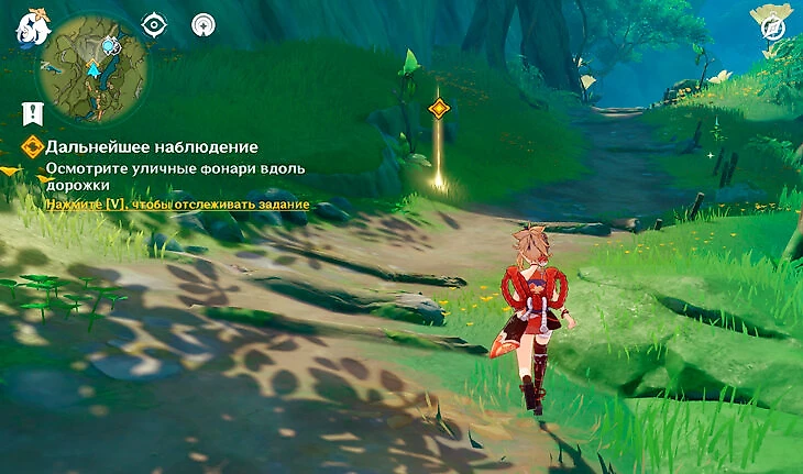 Тигнари поручит вам с Коллеи несложную задачу – очистить статую Дендро Архонта. Перед этим нужно осмотреть уличные фонари. Просто следуйте по дороге и подходите к ним, они будут засчитываться.