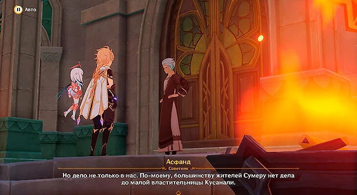 Их глава Асфанд объяснит, что жители Сумеру давно не верят ни в каких богов, поэтому от них будет сложно получить информацию. У Асфанда никаких данных про Кусанали тоже нет.