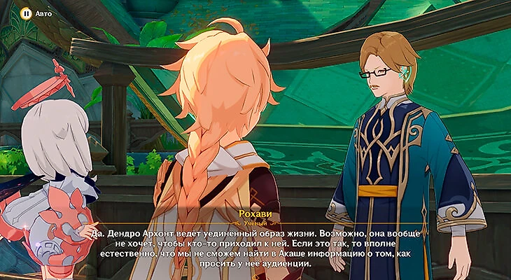 Поговорите с Рохави – исследователем, которого порекомендовал Тигнари. Он живет неподалеку от входа в город, сразу слева от ворот. Только он не поможет Путешественникам с поиском малой властительницы Кусанали.
