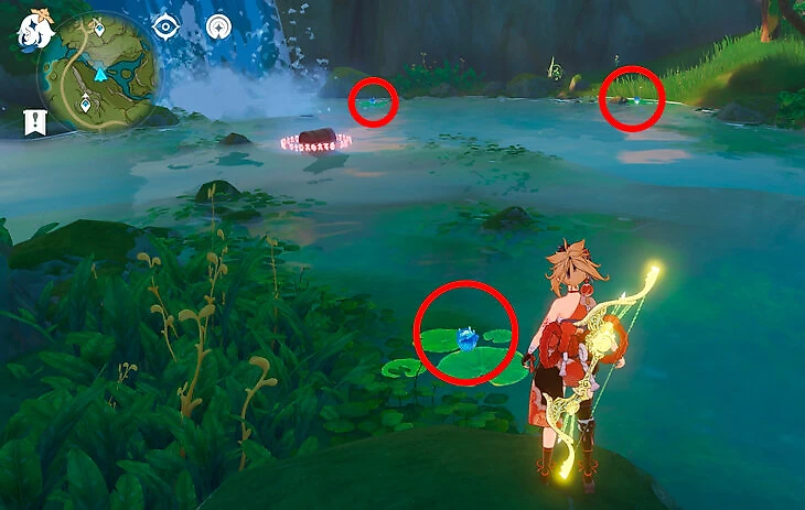 Утром выяснится, что Коллеи еще нездоровится. Тигнари расскажет о причинах ее резкого ухудшения самочувствия и о том, как ее редкую болезнь лечили Фатуи. Он предложит собрать четыре лотоса нилотпала, чтобы облегчить состояние Коллеи. Они выглядят как небольшие синие цветочки на больших листьях. На скриншоте отмечены три лотоса, еще один растет слева у самого водопада.
