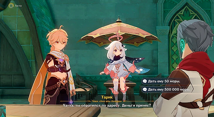 После этого поговорите с ними. Нужно выбрать варианты «Я учусь в Сумеру», чтобы вас не раскрыли, и «Дать ему 500 000 моры». Мору в конце концов вернут, так что не жалейте.