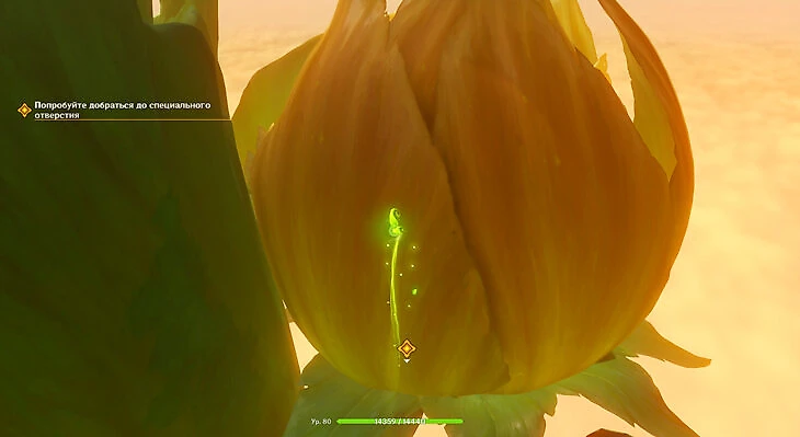 Посреди комнаты появится зеленый портал – зайдите в него. После этого вы превратитесь в росток и полетите к закрытому бутону. Когда доберетесь внутрь, заберите кусок янтаря.