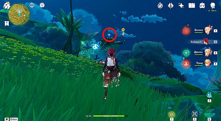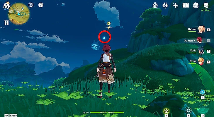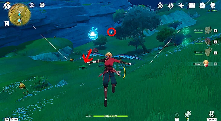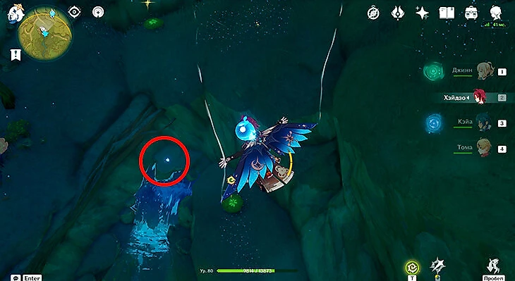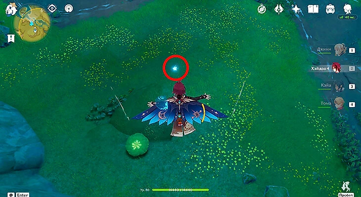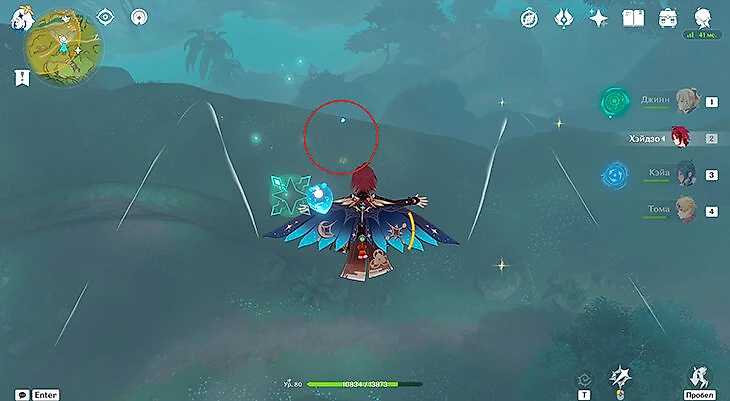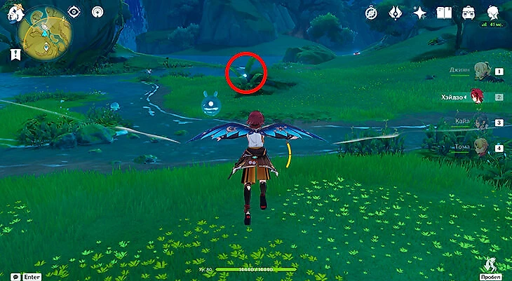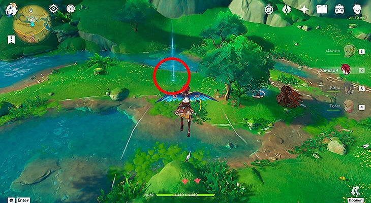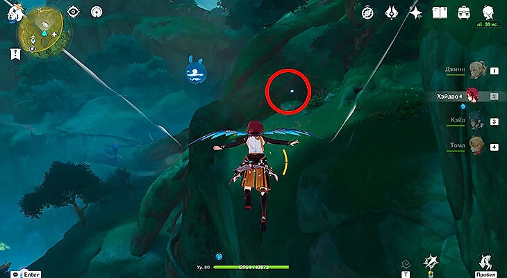 После их сбора можете лететь через Анемо-круги и примагнититься к крестику. Под ним находится последняя частица.