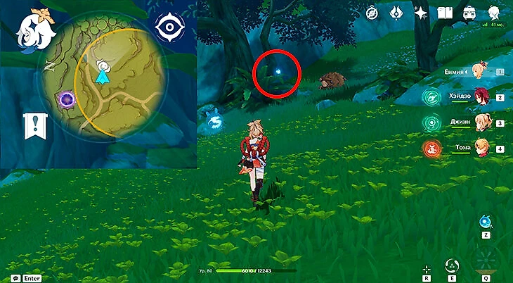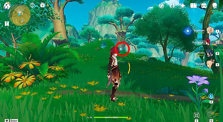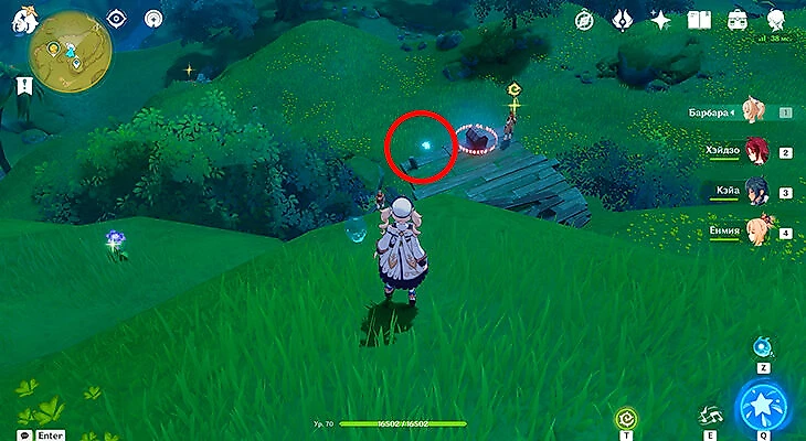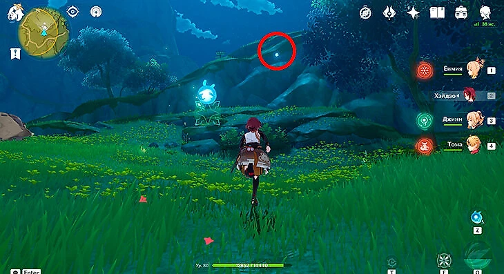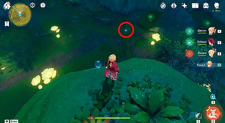 Совсем рядом со вторым сундуком находится первая часть энергии для поиска третьего. Подожгите любым Пиро-персонажем окружающие энергию кусты и заберите ее.