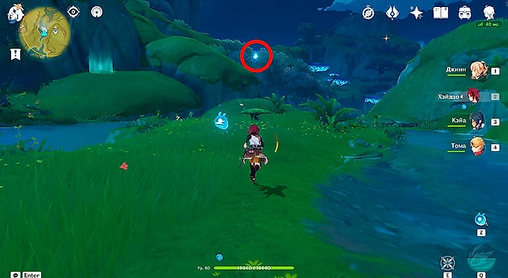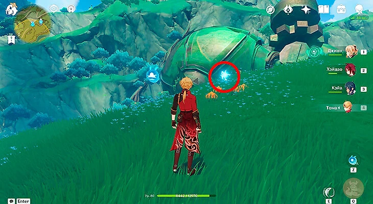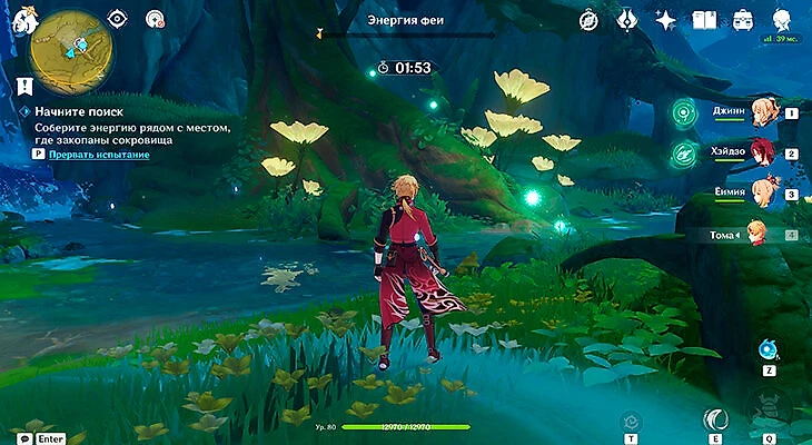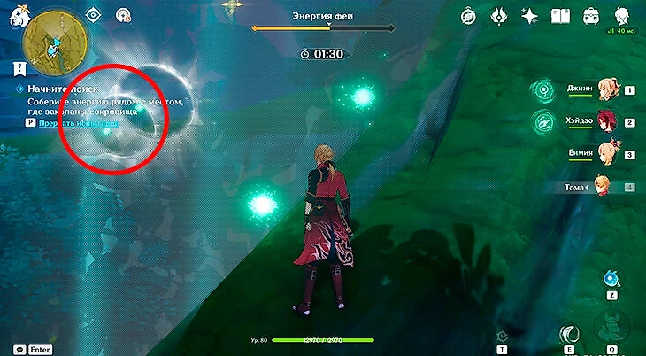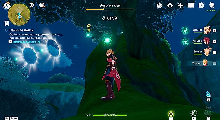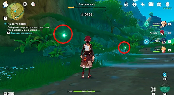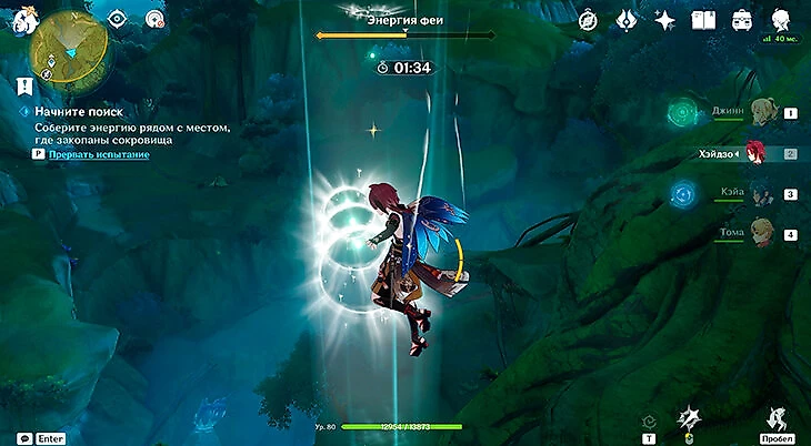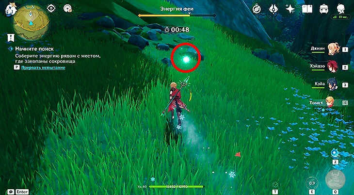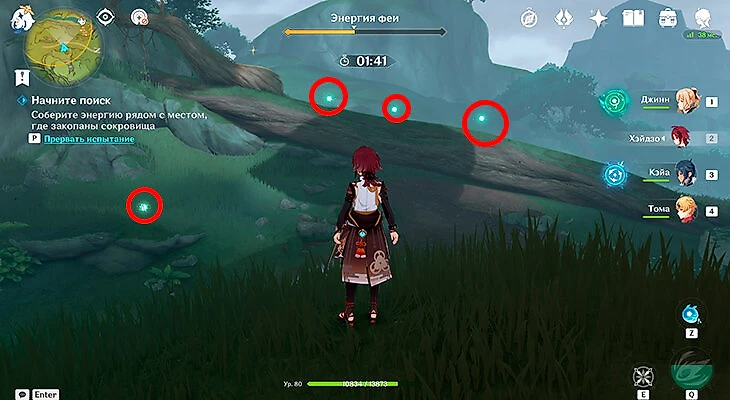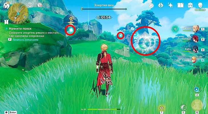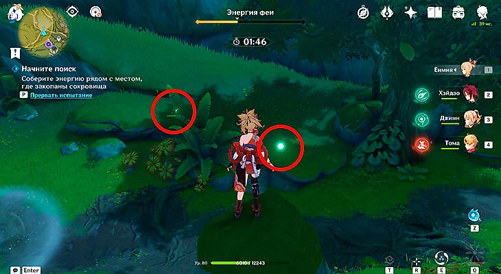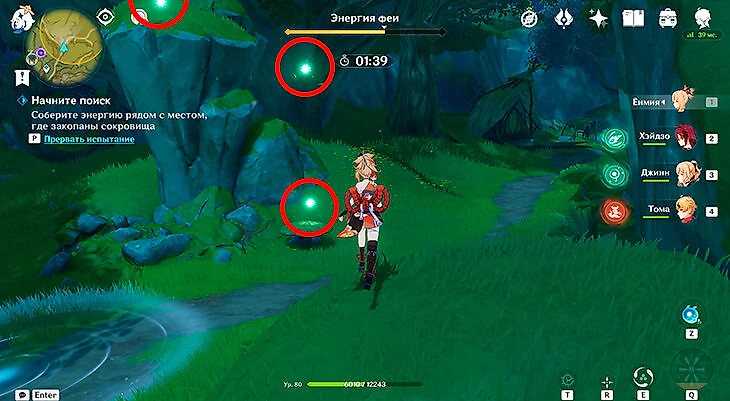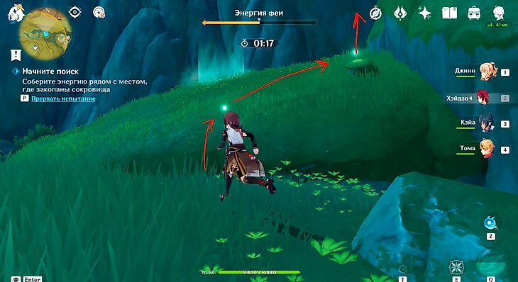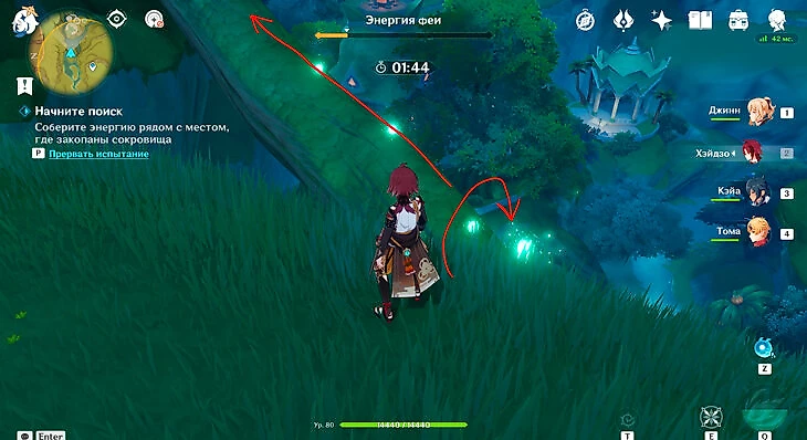 После этого подойдите к значку лопаты, отмеченному на карте, и начинайте испытание. Нужно будет драться с пиро и электро слаймами, а также с плесенниками. За победу над ними дают зеленую энергию, необходимую для заполнения шкалы энергии феи.