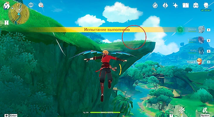 От места, где находится испытание, можете побежать налево (по горе) или направо (по дереву). Зеленые энергии расположены по кругу, вы в любом случае соберете все необходимое для заполнения шкалы. В водопад прыгать не надо, в анемо-барьер залетать тоже.