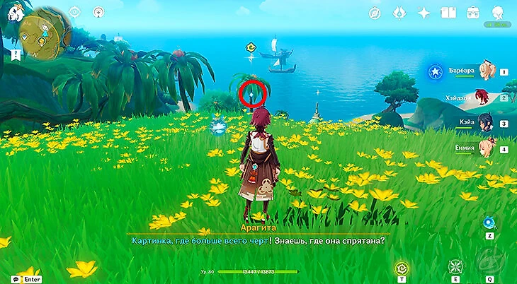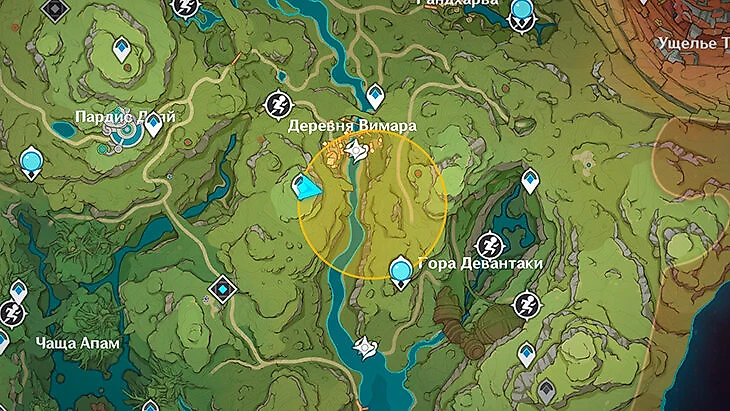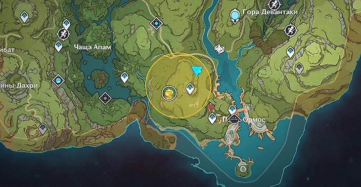 Чтобы начать задание, зайдите в меню особых событий и выберите кнопку «К заданию». В журнале квестов появится задание «Сокровища под лозой». Нужно поговорить с искателем сокровищ Ульманом в пригороде Сумеру. Он выдаст особую поисковую фею и журнал, где будут отмечаться карты сокровищ. Экипируйте фею в меню инструментов в инвентаре и посмотрите на карту.