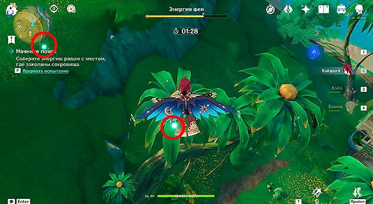 Отправляйтесь в область пещеры Чатракам. Когда вы дойдете до кружка с заданием, появится надпись, и вы сможете использовать фею. Посмотрите на мини-карту, там появятся значки энергии – всего нужно собрать три штуки, чтобы фея начала искать клад. Вот первые две.
