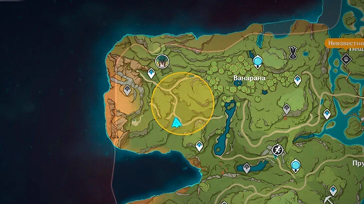 Место поиска сокровищ находится рядом со статуей Архонта в лесу Авидья. Экипируйте фею, когда зайдете в зону.