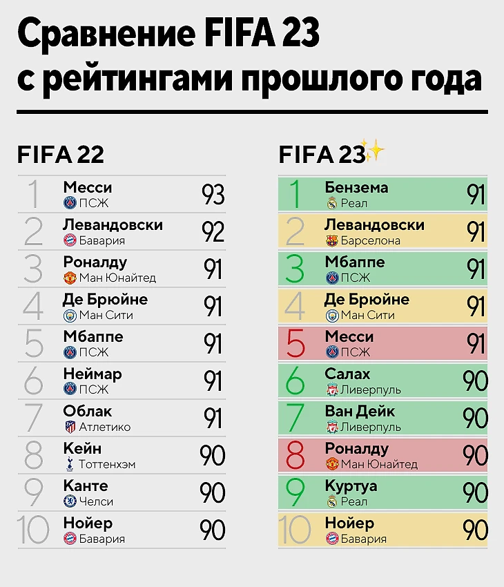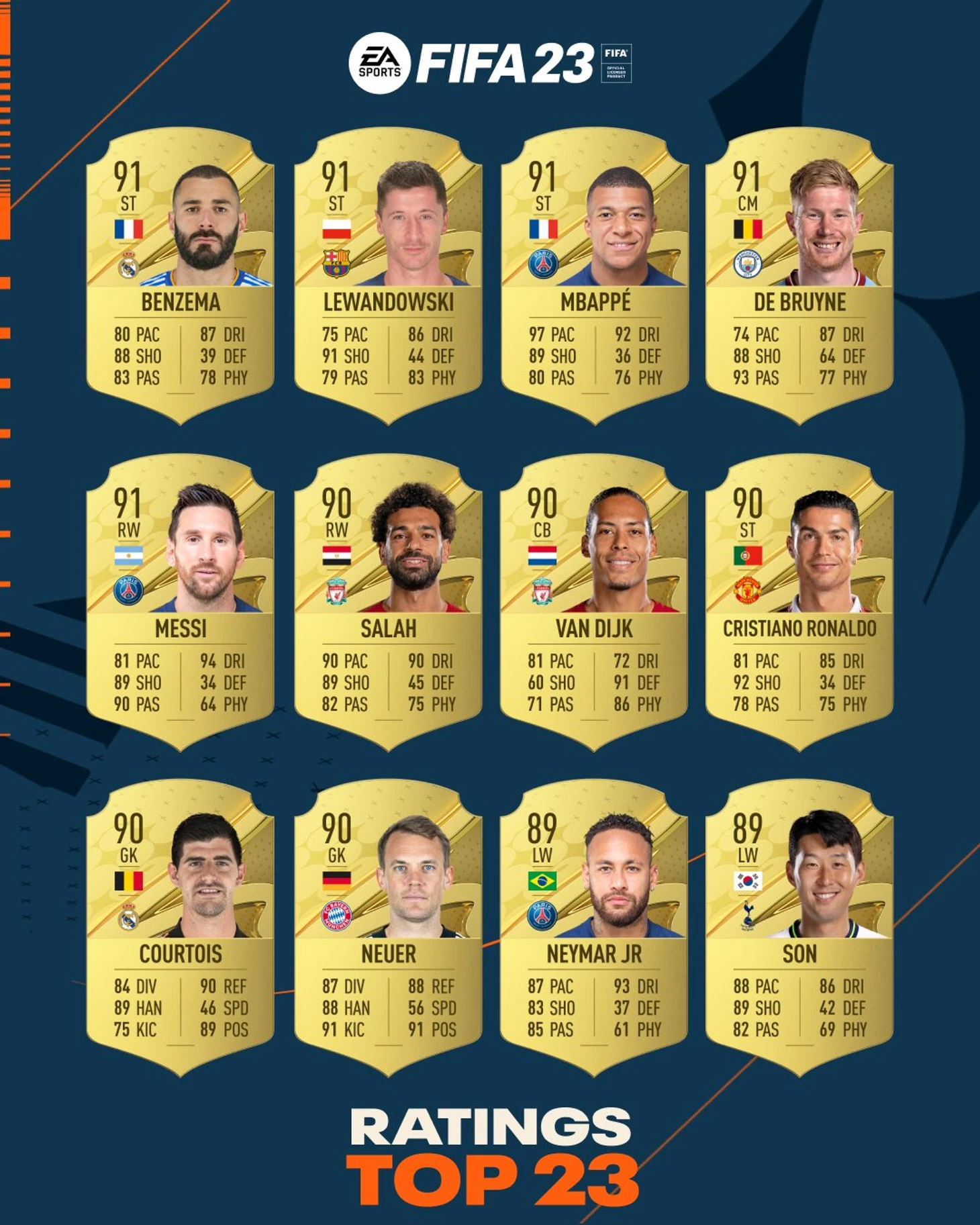 Вышли первые официальные рейтинги FIFA 23! EA Sports выпустила топ-23 и подтвердила информацию из утечек, хотя и изменила очередность карточек. Теперь в FIFA лидируют сразу пять игроков: Карим Бензема, Роберт Левандовски, Килиан Мбаппе, Кевин де Брюйне и Лионель Месси. Такого не было уже очень давно!