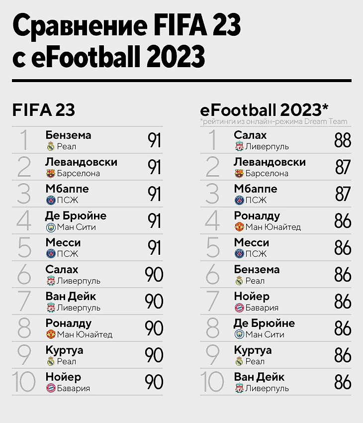 Сравнение рейтингов в FIFA 23 и eFootball 2023