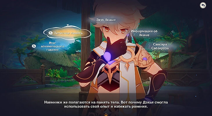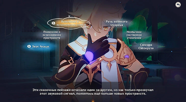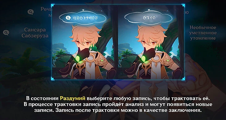 Нахида даст возможность самостоятельно подумать над произошедшим. В режиме раздумий прочитайте все надписи и сопоставьте те, которые подходят друг другу по смыслу, чтобы открылись новые записи. После прочтения новых записей выберите наиболее подходящую под ситуацию и нажмите «Подать заключение».