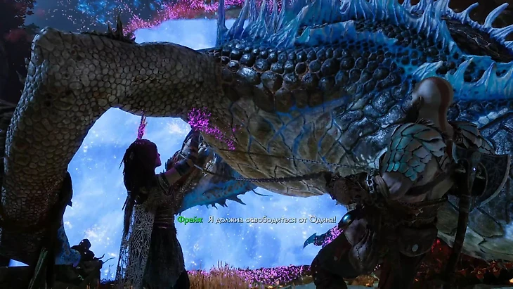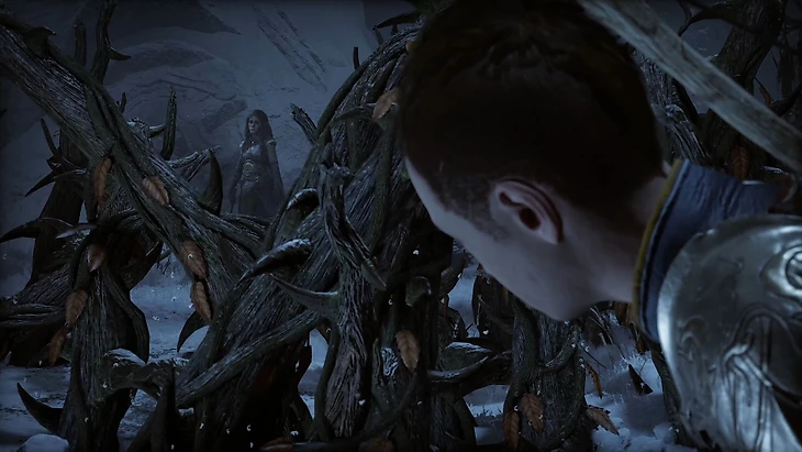 Подойти к ней из-за спины не выйдет – после того, как Атрей произнесет ее имя, из-под земли вырвутся корни и остановят Атрея. Во время диалога Фрейя четко дает понять, что помогать Кратосу в войне с Одином не собирается из-за убийства Бальдра. Фрейя прогоняет Атрея.