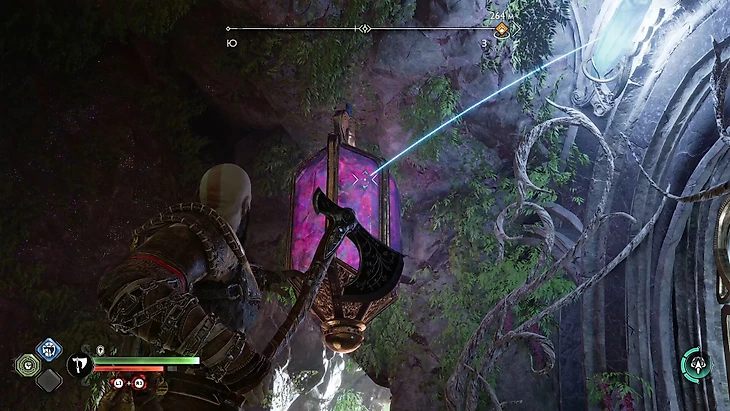 Открываем с Тюром по указаниям Атрея ворота и заходим в храм Света. Здесь нас познакомят с Сумеречными камнями – с их помощью нужно разбивать кристаллы света, чтобы пройти дальше. Бросаем топор в камень слева и проход откроется.