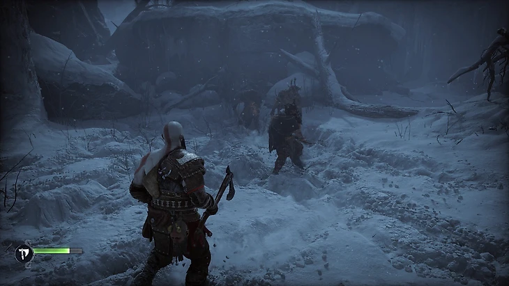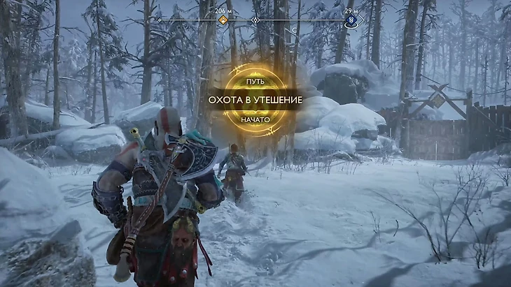 Выйдите из пещеры, и Атрей заметит несколько следов на снегу, которые ведут на юг, мимо упавшего ствола дерева. Продолжайте следовать за Атреем дальше на юг, где вскоре вы встретите большого оленя. После короткой заставки вы будете играть за Атрея. Нацелив лук на сердце оленя, оттяните назад (L2) и выстрелите.