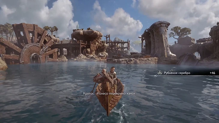 Появившись в локации «Болота», проходим с Атреем прямо и берем лодку. Кстати, именно здесь находится первый ворон Одина в игре (вы услышите характерный звон) – всего их 48. Если собираетесь проходить игру на платину, не пропускайте их. После небольшой драки с Эдлами садимся в лодку и плывем по реке. Желательно оглядываться по сторонам в поисках причала – нередко там можно найти рубленое серебро и другие ресурсы. Плывем прямо пока не наткнемся на первое препятствие – большое деревянное колесо. Его нужно будет повернуть.