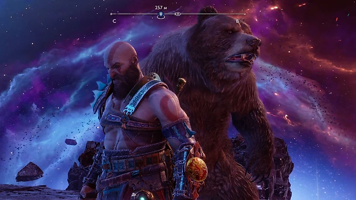 Медведь Бьорн – обучающий босс, не просто так его атаки столь неторопливы. Просто парируйте удары с желтыми сигналами, уворачивайтесь от красных ударов и бейте в ответ. Также Кратос впервые применит «Спартанскую ярость» и хорошо поколотит босса. Если спартанцу придется туго, подбирайте зеленые аптечки, раскиданные по арене.