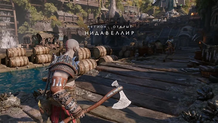 Для этого причаливаем к берегу справа от колеса. С помощью Левиафана замораживаем гейзер перед Кратосом. Если пойти направо, найдете сундук Норн. Нам нужно залезть на деревянную стену, которая расположена за гейзером. Далее предстоит небольшое сражение, а после него крутим колесо. Проплываем дальше и видим следующее препятствие – ворота. Их открываем с помощью цепи, которую найдете на одной из деревянных конструкций. Плывем дальше по реке и оказываемся в городе гномов – Нидавеллире.