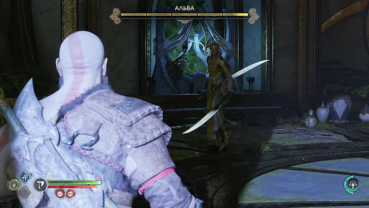 С точки зрения атаки здесь нет ничего нового. Одна из валькирий крутится на месте, и вы можете смело блокировать удары. Валькирии могут прыгать и врезаться в землю, хотя эту атаку вы можете парировать. Иногда обе валькирии улетают, а затем взмывают в воздух, но такие пикирующие атаки можно парировать и контратаковать. Как только уменьшите запас здоровья в первый раз, они восстановят здоровье и собьют вас с арены. Спасите Атрея.