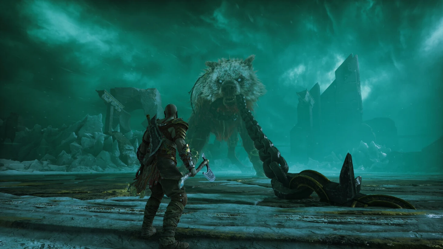 Во второй фазе Гарм швыряет лед и размахивает цепью, которая вскоре застрянет в камне. Бегите к цепи и заморозьте ее Левиафаном. После хватайте оковы и переверните босса. Повторите это три раза, а затем жмите нужные кнопки в QTE.