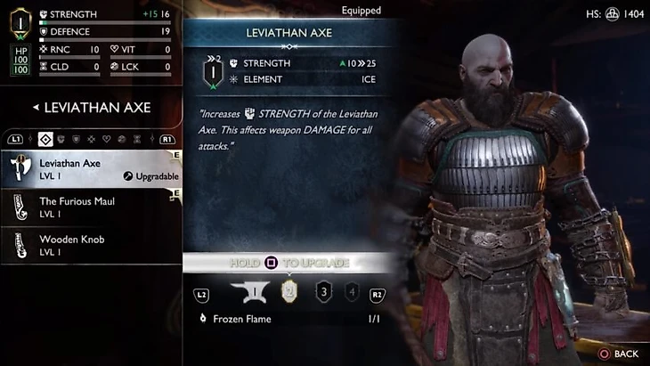 По умолчанию вы будете находиться на вкладке «Оружие», на которой вы сможете улучшить топор Левиафана, клинки Хаоса или щиты. Вы можете менять вкладки, нажимая L1 или R1. Всего здесь доступно 4 раздела: «Оружие», «Броня», «Специальные предметы», «Продать».