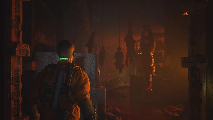 Не только визуал нагоняет жути. Еще одна фишка The Callisto Protocol – звук. По канализациям постоянно шумно лазают твари, в соседнем помещении кто-то хрипит, охранники и заключенные истерично орут. Все посторонние звуки сильно напрягают.