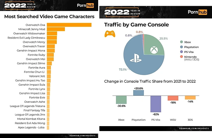 Владельцы PlayStation заходят на Pornhub чаще других консольщиков. В 2022-м трафик с PS вырос на 20,6%. А вот обладатели Xbox посещают сайт на 30,6% реже, чем в прошлом году.