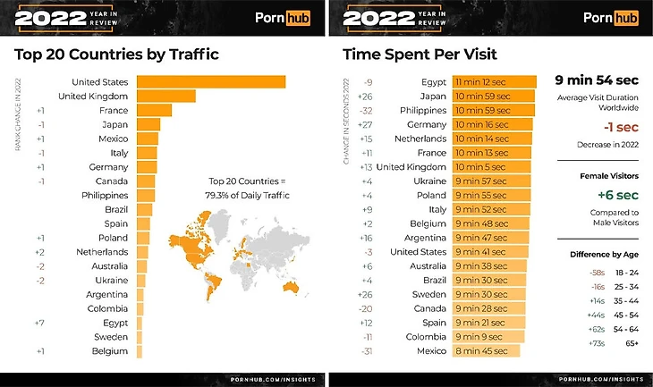 В среднем на сайте проводят 9 минут 54 секунды, что на секунду меньше, чем в 2021-м. Зато женщины зависают на шесть секунд дольше, чем год назад. На первом месте жители Египта, они смотрят видео по 11 минут 12 секунд.