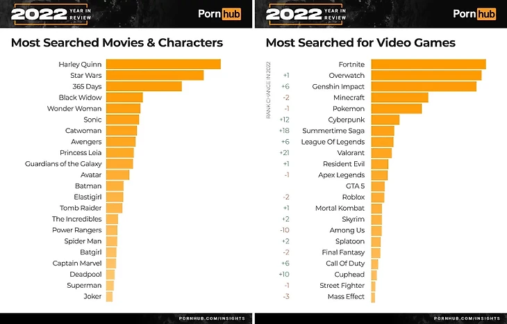 Pornhub делится статистикой каждый год. Из нее мы узнаем имена новых звезд, радуемся, что D.Va и Харли Квинн все еще в топе, и удивляемся сексуальности ежика Соника. Изучаю итоги 2022 года!