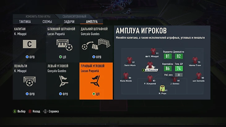 Не задумывайтесь над выбором тактики. В этом меню много страшных ползунков, но стандартные настройки отлично работают. Лучше настройте схемы под разные планы игры (от «сверхзащитного» до «сверхатакующего») и вручную выберите амплуа игроков. Для штрафных подойдут мастера с обводящим ударом, для угловых нужны футболисты с закруткой в сторону ворот.