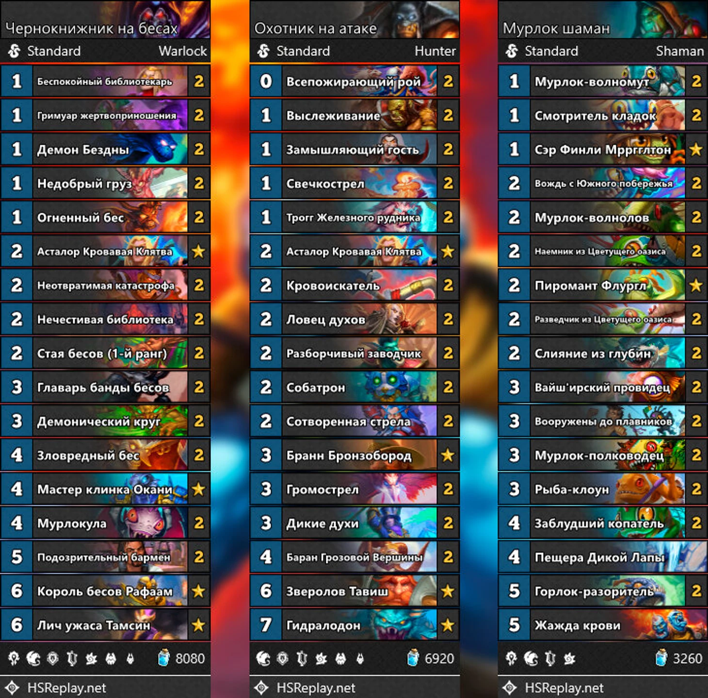 Мурлок-шаман – пушка, бомба, если пыли не очень много, а повеселиться хочется. Он слаб против ДХ и ДК, но в остальном у него неплохие матчапы с остальными классами (особенно после нерфа разбойника). В нем всего два эпика, которые нужно крафтить, поэтому бюджета хватит у каждого.
