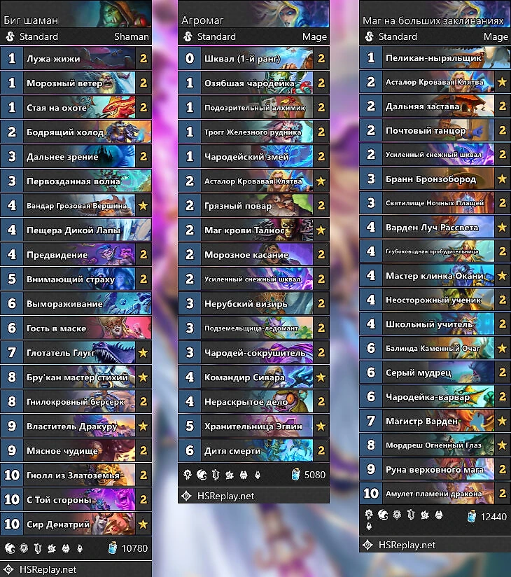 Проверенная временем колода большого мага не особо эффективна в погоне за рангами, зато хорошо работает против ДК, если вас задолбало встречать их. Приятный бонус – не менее высокий винрейт против жрецов, но в мете их не так много, чтобы кто-то жаловался.