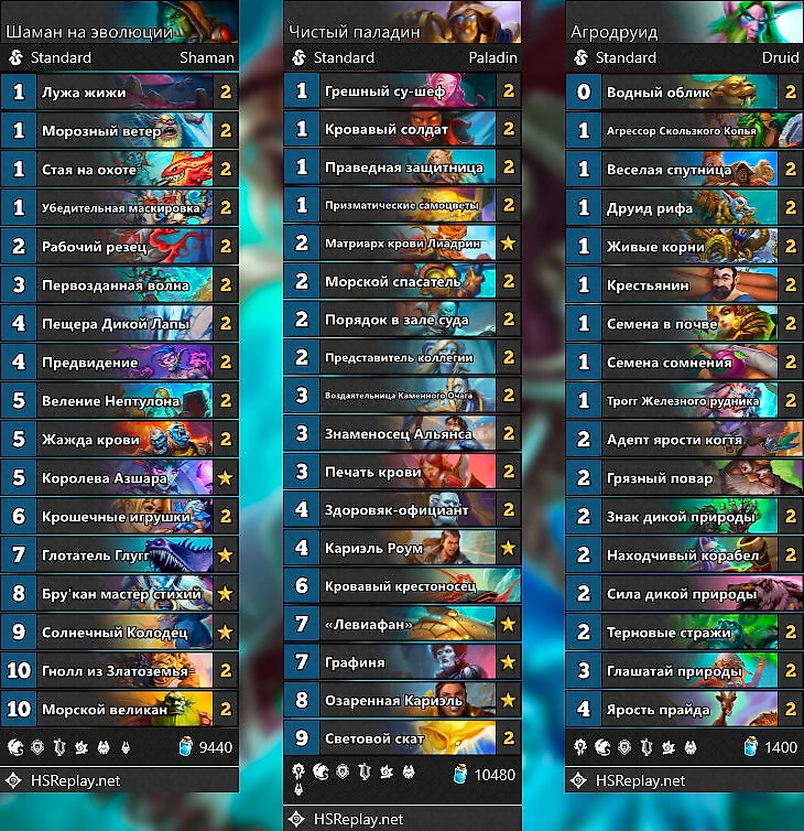 P.S. Я хз, откуда на хсреплее у пьюр-Паладина 60+% винрейта. Колода, которая сама себе к 6 ходу отгрызает треть лица, выигрывать в текущей мете слабо способна. У меня получилось что-то вроде 50% со дна до Алмаза-5. До легенды ехал уже на ФДК, Паладин просто застрял на одном месте
