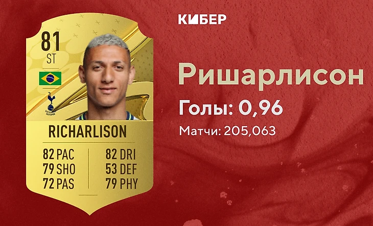 Эффективность Ришарлисона необъяснима. Бразилец получил невзрачную карточку с невысокой скоростью, средними ударами и дриблингом, которые едва спасают 5 ⭐ слабой ноги. Карточку впору назвать неиграбельной, но из-за любви к АПЛ некоторые фиферы взяли Ришарлисона в первые сборки. 0,96 гола за матч – отличный результат для таких стат.