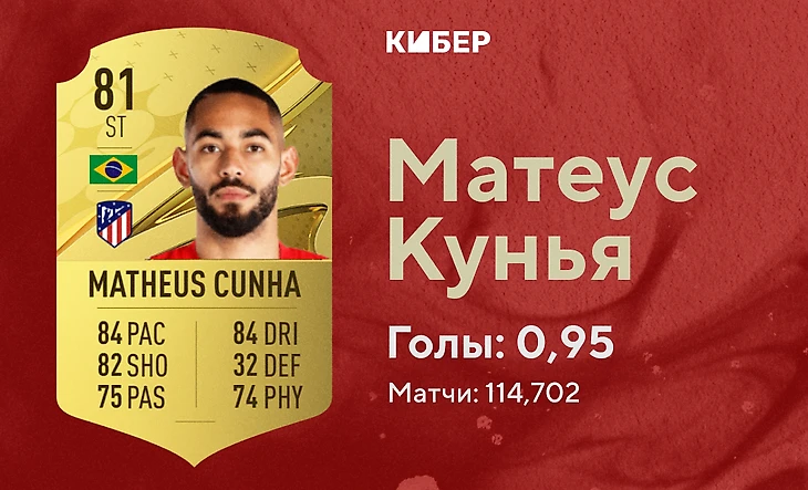 Вы вряд ли помните Матеуса Кунью. Нападающий ярко играл за «Герту», но сник в «Атлетико» и отправился в аренду в «Вулверхэмптон». В FIFA он получил неплохую карту, которой недостает только баланса. Сейчас Кунья явно уступает бывшему одноклубнику Анхелю Корреа и почти не встречается в составах.