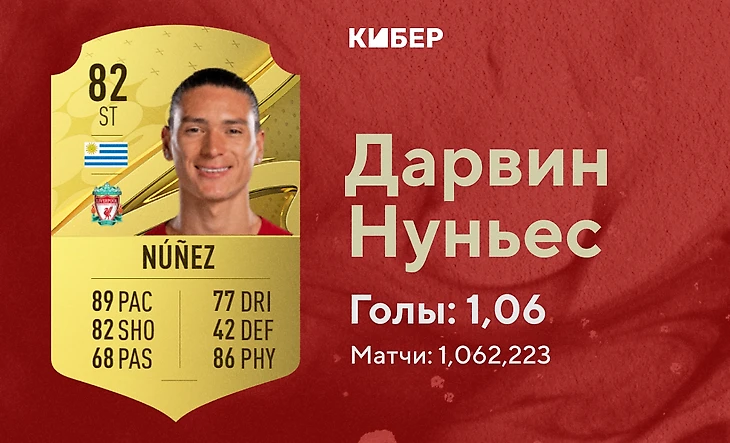 Дарвин Нуньес не слишком хорошо стартовал в «Ливерпуле». Проблемы были и в FIFA: звездный уругваец уехал в Англию за 80 млн евро, но получил реалистичную модель в FUT лишь в январе. Статы дали тоже средние – 3 ⭐ навыков/слабой ноги и плохой баланс. Дарвина выручило длительное ускорение. Оно имбовало в первые месяцы после релиза, а уругваец под «Ястребом» врывался в штрафную и напоминал мини-Холанда.