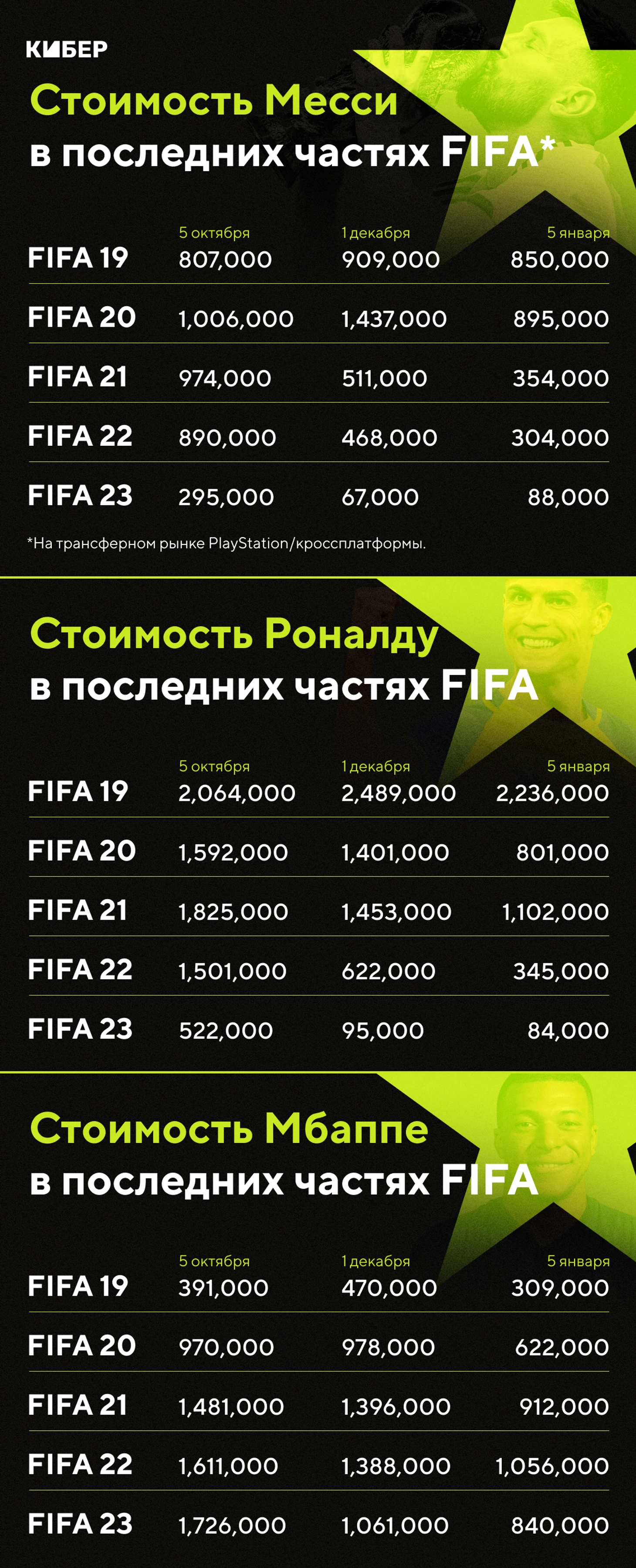 Карточки футболистов правда упали в цене? Я взял тройку мировых звезд: Лео Месси, Криштиану Роналду и Килиана Мбаппе и сравнил динамику их стоимости в разных частях FIFA. Падение рынка FUT поражает! Из-за высокого спроса дорогие игроки держали цену лучше остальных, но EA обрушила цену даже на них.