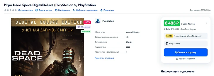 Предложения о продаже Dead Space 2023 на PlayStation есть не только на профильных сайтах магазинов вроде Gamebuy или Videoigr.net, но и на Ozon.