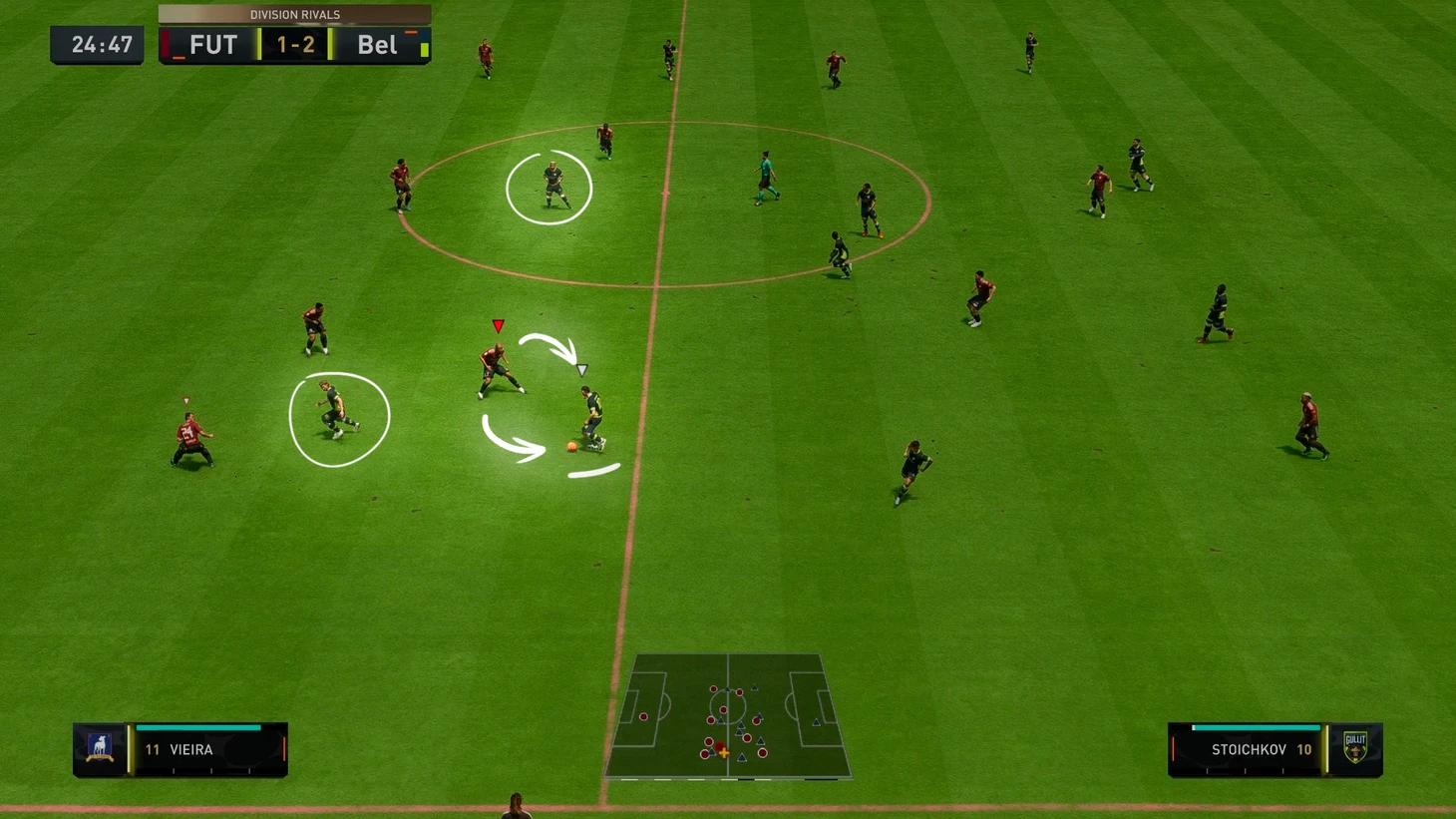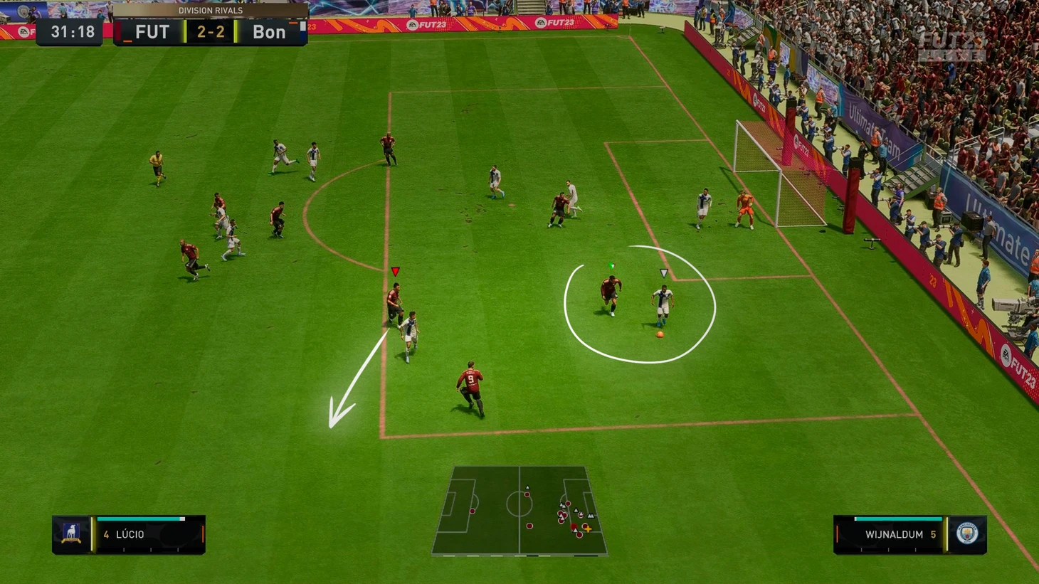 Еще один популярный вид отбора – прессинг. Сдерживание управляемым игроком (A/крест) бесполезно и применимо только для сокращения расстояния в стандартных ситуациях – лишь тогда игрок движется по прямой. Если вы нажмете на сдерживание сбоку и сзади от соперника, то футболист потеряет ворота и упустит его.