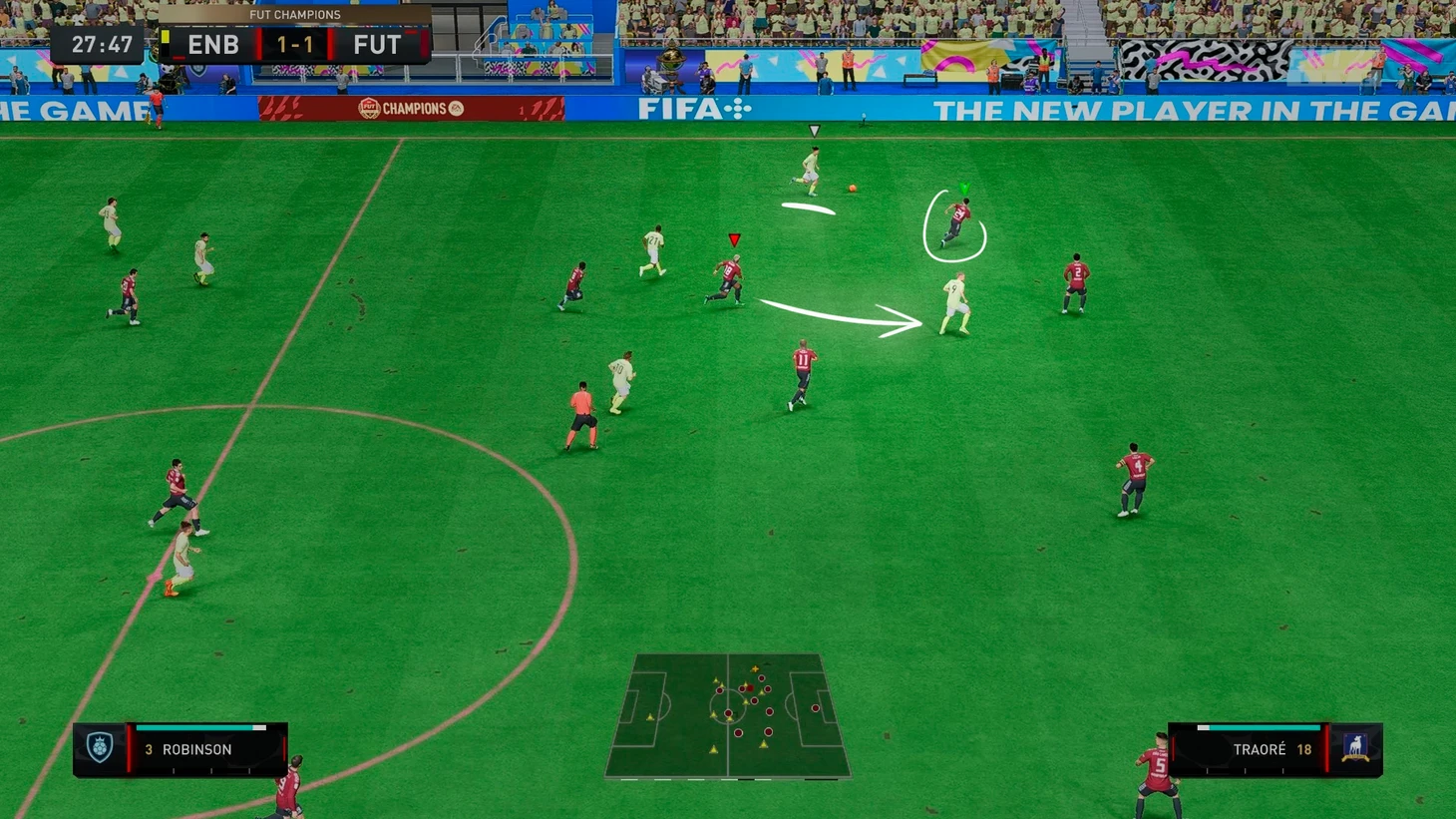 Интересно выглядит блокирующий жокей на чужой половине поля. Он почти не требует движения, но мгновенно перекрывает зоны для передач вокруг вашего игрока. Соперники ждут ручного прессинга или аккуратного следования и часто теряют мяч при выходе из обороны после стандартов.