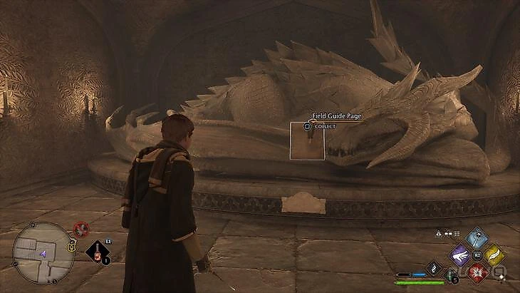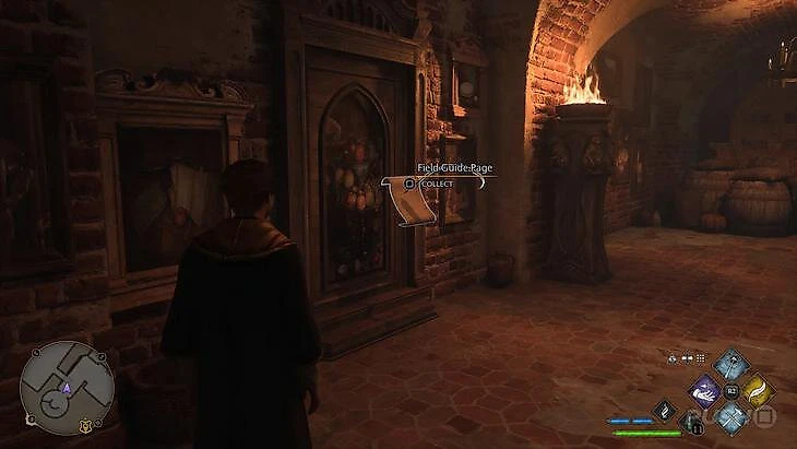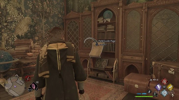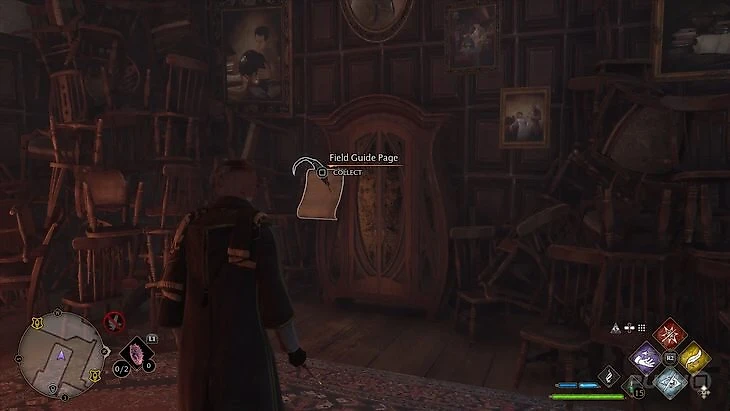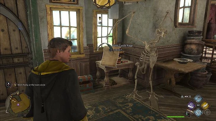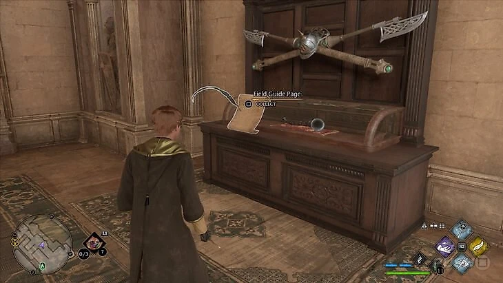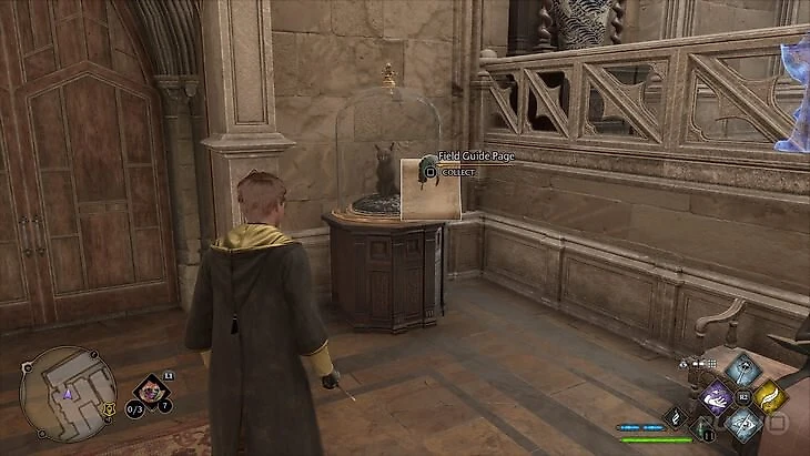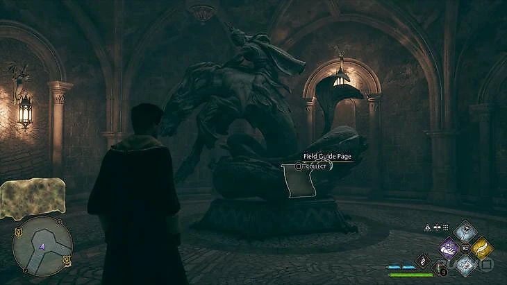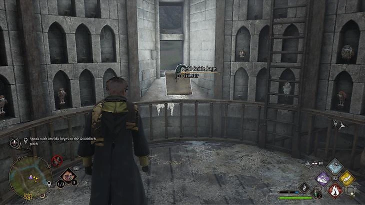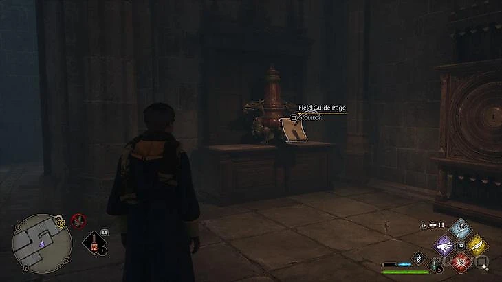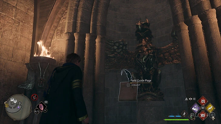 От летучего пламени в башне защиты от темных искусств спуститесь по лестнице вперед, а затем вниз направо. Около дальней стены стоит деревянный шкаф со скелетом птицы внутри – перед ним висит нужная нам страница.