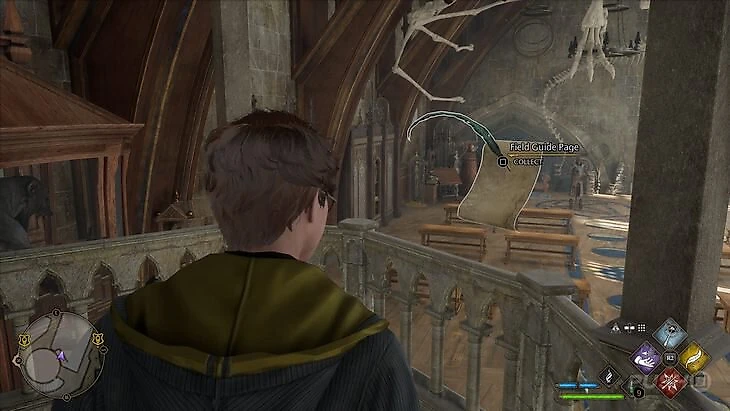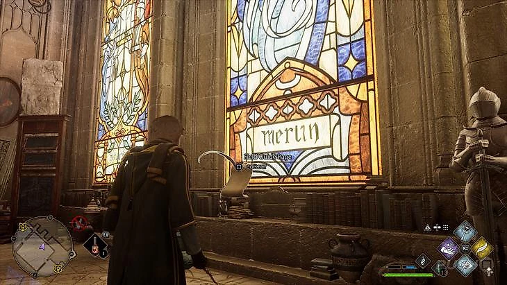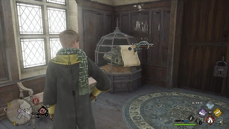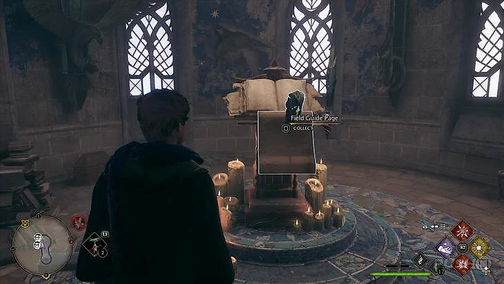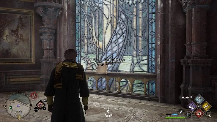 От летучего пламени в классе защиты от темных искусств спуститесь по лестнице направо. Пройдите вперед мимо скелета животного, затем поверните направо, чтобы оказаться перед высоким витражным окном. Здесь вы найдете эту страницу.