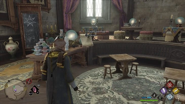 От летучего пламени в классе прорицаний поднимитесь по винтовой лестнице. Сверху поднимитесь еще раз по появившейся лестнице. Там в центре комнаты найдите страницу у столика с моделью руки.