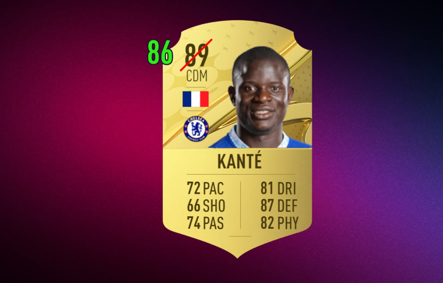 Нголо Канте – легенда последних частей FIFA. Юркий опорник вырывал мячи у крупных оппонентов, поэтому его часто покупали любители АПЛ. В FIFA 23 Нголо заметно ухудшили. Скорость 72 со смешным спринтом 68 больше не впечатляет, а невысокая сила окончательно добила реальные статы опорника. Кажется, былого Канте мы уже не увидим.