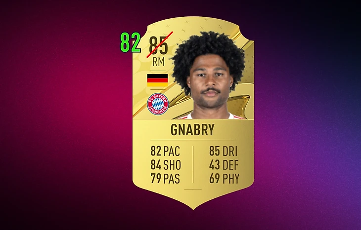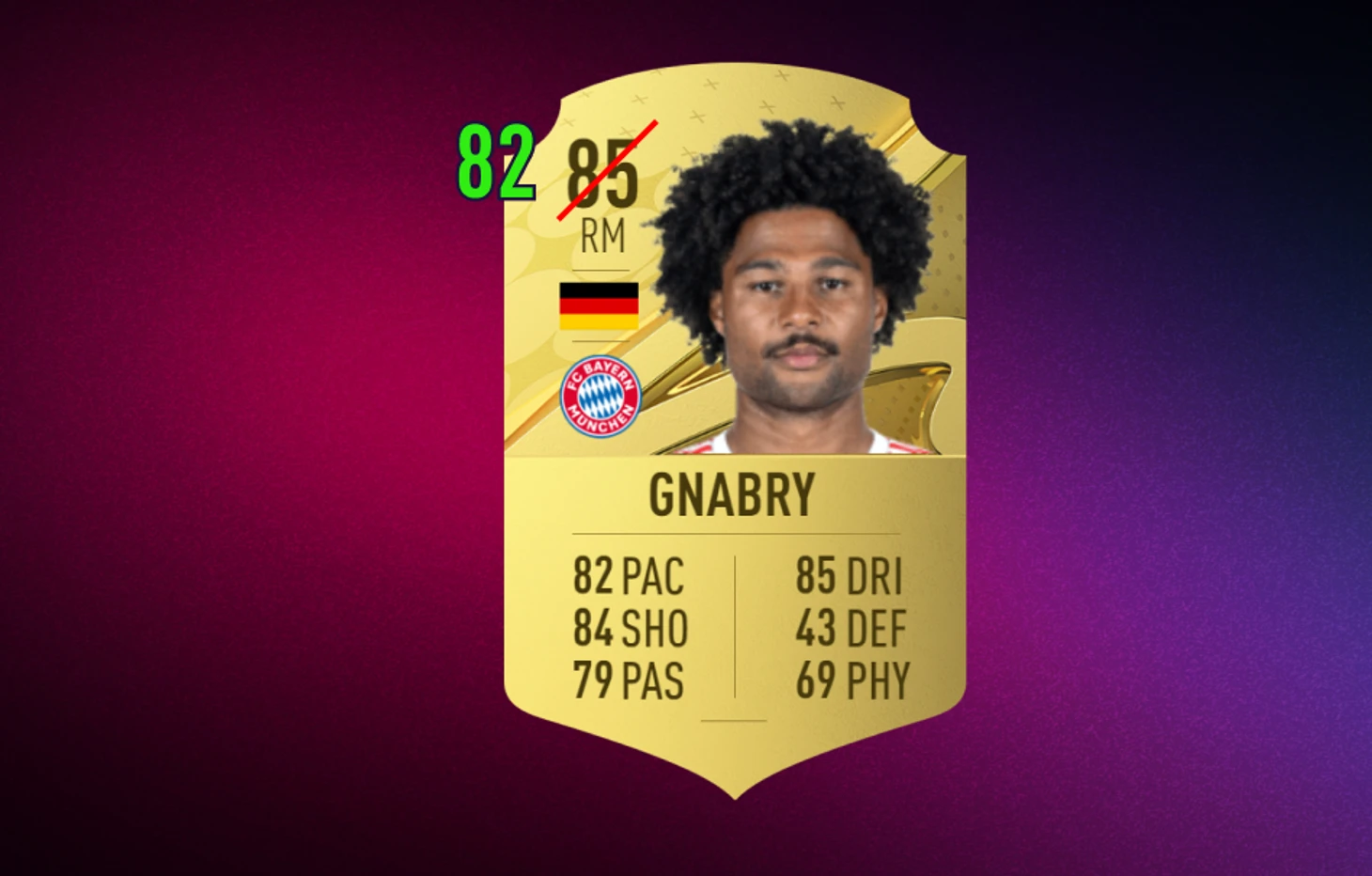 Игроки «Баварии» – одни из самых переоцененных в FIFA 23. Мы не стали мучить уникального Томаса Мюллера, но его место занял одноклубник Серж Гнабри. Немецкий правый полузащитник получил медленный спринт 79, поэтому его реальный рейтинг на позиции на три пункта ниже – всего 82 балла. Идеальная позиция Гнабри – под нападающими (83).