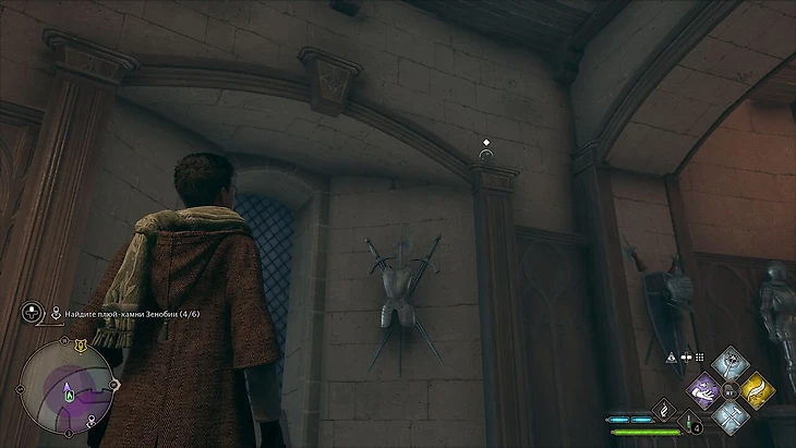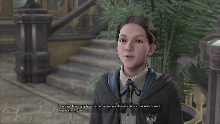 Чтобы взять побочку «Целая куча плюй-камней», подойдите к Зенобии и заговорите. Она стоит слева от лестницы около класса защиты от темных искусств: точное местоположение видно на скриншоте. Там же видны и места, где спрятаны камни: чтобы найти их быстрее просто идите по маршруту к ближайшему камню. Если вы брали задание давно, то для отображения камней на карте нужно сделать квест активным.