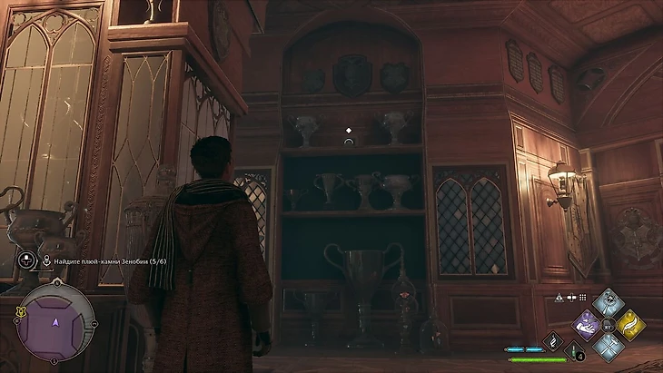 Этот найти чуть сложнее. Выйдя из точки летучего пламени в зале трофеев, развернитесь и войдите в большую комнату с трофеями. Дойдите до ее центра и взгляните чуть левее: на полке с кубками сияет последний плюй-камень.