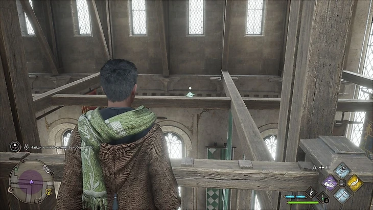 Выйдя из точки летучего пламени у класса прорицаний, развернитесь и взойдите на деревянный помост. Пройдите вперед метров 10 и слева на деревянных балках увидите очередной камень.