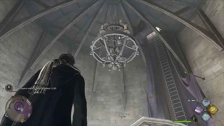 Выйдя из точки летучего пламени у класса прорицаний, поднимитесь по винтовой лестнице и взгляните на огромную люстру на вершине башни прорицаний. Туда ребята и забросили плюй-камень.
